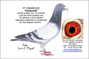 | Pai: 2560491/02 POR - "Casagrande" | Mãe: 8282-09-3/25 ALE - "Neta do Flitzer" | "Casagrande" Raça: Augusto Amorim Macho Azul Adquirido na venda totla do José Augusto Amorim. Grande voador, fez 1º de Mértola, 1º de Montemor, 2º de Estremoz, etc. Os filhos ganharam 1º Tarifa, dist., 1º Castro Verde, 1º Almodôvar, 1º Portimão, etc.