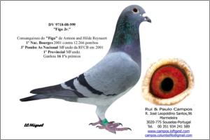 | Pai: 9718-08-9/99 ALE - "Figo Jr." | Mãe: 6548430/06 POR - "Rodriga" | "Figo Jr." Macho Azul Guias Brancas Duplo Neto do "Figo" de A. & H. Reynaert, 1º Nacional de Bourges/01 12.266 pombos e 3º Pombo As Nacional MFundo da RFCB em 2001 e 1º Provincial MFundo. Ganhou 16 1ºs.