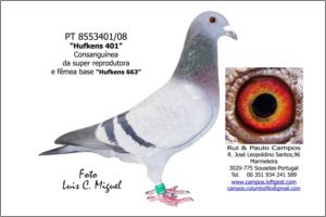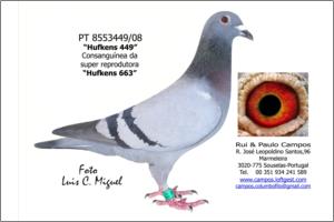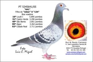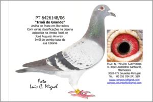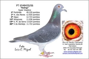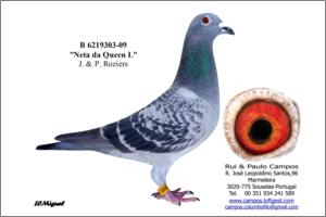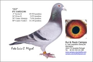 Raça: Rui & Paulo Campos Fêmea Pedrada Grande voadora, foi Anilha de Ouro Distrital de Velocidade - Zona 3 Aveiro em 2009 e em 2010 foi o 2º melhor Pombo Sport Velocidade na Exp. Distrital em Travanca e foi seleccionada para a Exposição Nacional em Tavira 2011.