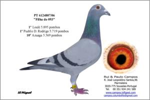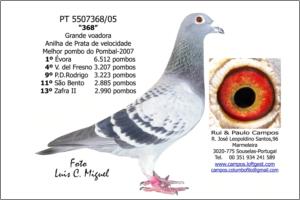 "Filha do Geerinckx 678" Raça: Rui & Paulo Campos Fêmea Pedrada A melhor voadora da campanha de 2007. Anilha de Prata de Velocidade. 1º Évora 6.512 pombos 4º V. N. Fresno 3.207 pombos 9º P.d. Rodrigo 3.223 pombos 11º São Bento 2.885 pombos 13º Zafra 2.990 pombos