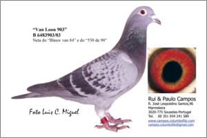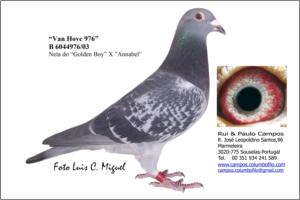 "Van Hove 976" Raça: Van Hove-Uytterhoeve Fêmea Pedrada Importada a Van Hove Uytterhoeven. Mae da Anilha de Prata MFun do Especial em 2006 no GCMealhada. Mãe da Anilha de Ouro Distrital Meio Fundo - Zona 3 Aveiro em 2009 e vencedora do Dia da Associação, contra mais de 40.000 pombos.