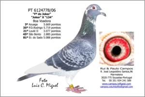 "Fª do Joker" Raça: Rui & Paulo Campos Fêmea Pedrada Guias Branca Boa voadora Azuaga 3º/5.569 pombos P D Rodrigo 35º/5.719 pombos Loulé II 21º/3.077 pombos São Bento 45º/2.885 pombos Ermidas Sado 81º/5.088 pombos