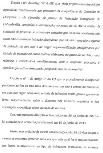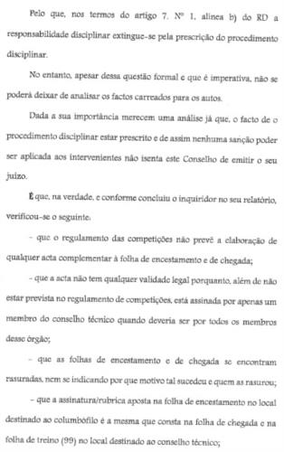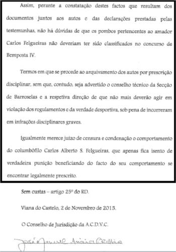 Igualmente merece juízo de censura e condenação o comportamento do Columbófilo Carlos Alberto S. Felgueiras que apenas fica isento de verdadeira punição beneficiando do facto do seu comportamento se encontrar legalmente prescrito”
