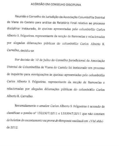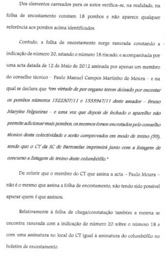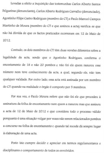 “Assim perante a constatação destes factos que resultam dos documentos juntos aos autos e das declarações prestadas pelas testemunhas, não há dúvidas que os pombos pertencentes ao Sr Carlos Felgueiras, não deveriam ter sido classificados no Concurso Bemposta IV.