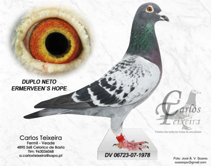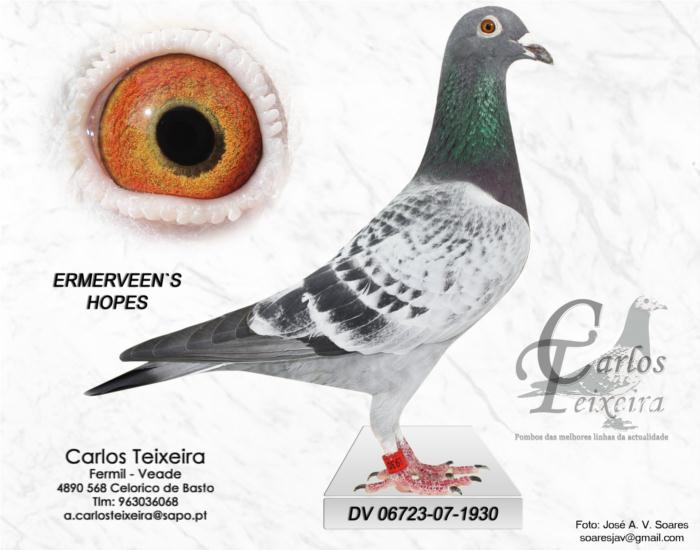 ERMERVEENS HOPE – NL00-4728193, Pombo Olímpico (classe Absoluta) em Lievin ’03. Vencedor do 1º Nac. Orleans contra 9188 pb., 1º Boxtel contra 2397 pb., 2º NPO Ablis contra 13020 pb., 2º Hannut contra 4393 pb., 4º Chimay contra 1000 pb., 6º Chimay contra 4149 pb.. O Pai é o JONKER DOFFER e a mãe é a JUDY (uma irmã do KLEINE DIRK).