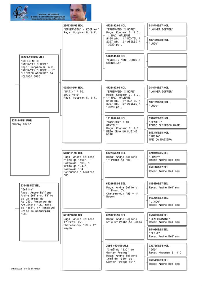 Uma linda fêmea pedrada, com o número 1371048/11, de excelentes Origens. O Pai é um Duplo Neto do ERMERVEEN'S HOPE de Gerard Koopman e a mãe é uma original Andre Bellens, da Bélgica.