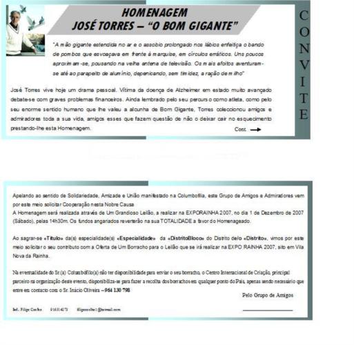 A 1 DE DEZEMBRO DE 2007, UM GRUPO AMIGOS, ENTRE OS QUAIS SE DESTACA O SR. INACIO OLIVEIRA, PROPRIETARIO DO CENTRO INTERNACIONAL DE CRIAÇÃO E DO SR. CARLOS TEIXEIRA, PRESIDENTE DA ASSOCIAÇÃO COLUMBOFILA DO DISTRITO DE LISBOA, LEVARAM A CABO UMA INICIATIVA INÉDITA NO NOSSO PAIS. REALIZARAM UMA HOMENAGEM E LEILÃO DE POMBOS EM QUE A TOTALIDADE DOS FUNDOS ANGARIADOS REVERTERAM A FAVOR DO "BOM GIGANTE" - JOSÉ TORRES, LENDÁRIO JOGADOR DO BENFICA, SELECÇÃO NACIONAL E POSTERIORMENTE SELECCIONADOR.