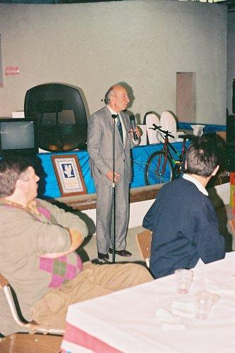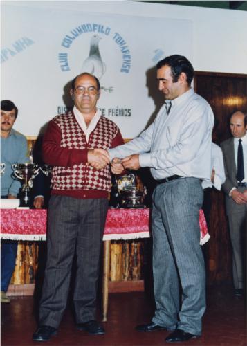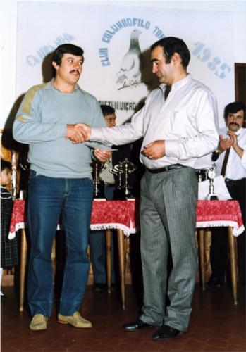 Entrega de Prémios do Clube Columbofilo Tomarense em 1985. Fernando Oliveira a entregar o prémio a Eduardo Correia