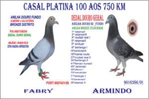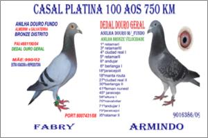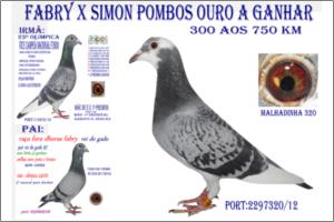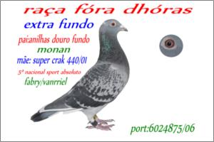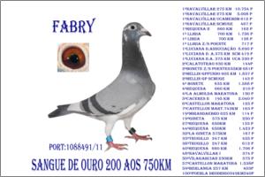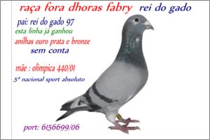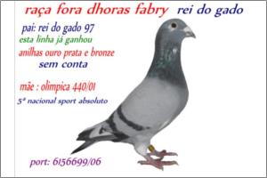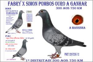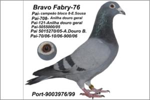 "O 76 o « OURO do POMBAL »" Raça: Fabri Macho Azul Tipo: Reprodutor Este macho é pai de vários pombos dos melhores NACIONAIS 2005 - 5* Sport Absoluto ,- 16*.- M/F (2006 ),- 21*.-( Fundo 2006 ) .- 29*- S. Absoluto 2007 18*.- S. Absoluto 2005. Faz casal com a irmã do papa-97. São pais da 5270/05 - 50000/05 & da 900/06. Talvez o único casal com este Palmarés.