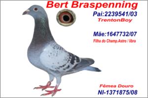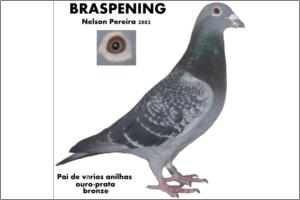 "Braspening Nelson Pereira 02" Raça: BRASPENING Macho Pedrado Tipo: Reprodutor Este pombo é pai de vários campeões Grandola ( Carlos),A 30 J R Silva (coruche) , A 24 do FORA