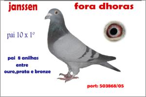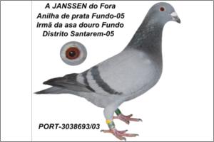 "Anilha Prata Fundo05-A Janssen" Raça: Fabry / Janssen/Hofk Fêmea azul Tipo: Reprodutor Esta femea só voou 6 Concursos e foi Anilha Prata Fundo. A irmã foi ASA DOURO do Distrito Santarem (é obra). O Pai é um macho linha HOFKANS-97 -Pai de vários pombos de Fundo. A mãe é uma femea fora de série linha Fabry / Janssen. A crak do Zé Alfredo é irmã