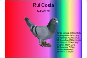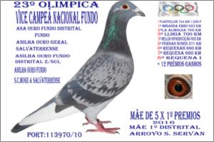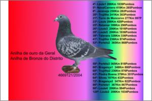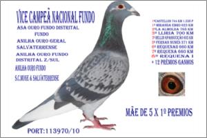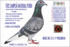 Macho PAI DE 3 X 1º PRÉMIOS EM POMBAIS DIFERENTES , IRMÃO DA SUPER CRAK 113970/10 QUE GANHOU SÓ EM 2014,,23ª OLIMPICA ,, VICE CAMPEÃ NACIONAL FUNDO 2014 ,, 6ª NACIONAL MARATONA,, ASA DOURO FUNDO DISTRITO TOTAL ,, ANILHA DOURO FUNDO DISTRITO Zona Sul ,, ANILHA DOURO GERAL SALVATERRENSE ,, ANILHA DOURO FUNDO SALVATERRENSE e MUGE , ANILHA BRONZE GERAL MUGE.