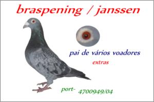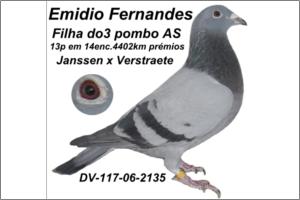 "78 do FERNANDES « JANSSEN »" Raça: Janssen Macho Pedrado Tipo: Reprodutor O Pai deste macho é KALLEN- Hahn-Kijewski « Van Loon »ganhou 2006-11p e 2007-12 premios, o avo 4117-00-473 ganhou 75prémios. A Mãe é consaguinia do 136 «56 p » -do FERNANDES e filha do 3 ( pombo AS - Vogel ). O Fernades déve ser o melhor columbófilo portugues no estrageiro que eu conheço,como HOMEM e Columbófilo