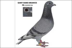 "GABY RABO BRNCO-NL05" Raça: Gaby Fêmea azul guias brancas Tipo: Reprodutor Esta femea é filha do THE SCOTTY-216 e néta do THE POWER MAN-727« 3*-ASDUIF Kring05. A Mãe" MISS SAIGON "é filha de " IncestWITBUIK"54 (Cees Gijzen) e néta de TOPPER416 x FLOR Engels. Esta pomba foi da aposta no DERBY da Holanda.