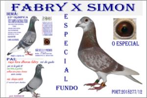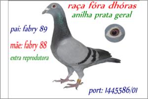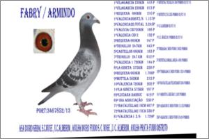 "IRMÃ do PAPA 97" Raça: Fabri Fêmea Azul Tipo: Reprodutor A Irmã do PaPa97 é filha do melhor casal FABRY que alguma vez vi « PAPA 92 x AZUL 94 ( Manuel Luis Ferreira ) Fabry directa. É Mãe da,-440/01,- (5* naçional Abst ) .- 317/01 ( Marcelino Carreto ),-990/02 extra voadora e reprodutora ,-1518/02 ,- 50000/05 ,-5270/05 ( anilha douro ) 10/06 ,- 70/06 ,- 799/02 ,- 900/06.- 25/05 .- e do super reprodutor 300/05. Faz casal com o « 76/99 ». Deve ser o casal com mais filhos classificados nas exposições NACIONAIS.