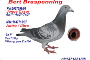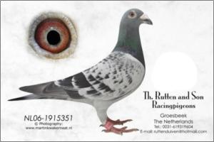 " De Raket " o meu CRAK" Raça: Janssen Arendonk Macho Pedrado Tipo: Reprodutor De Raket 351 is Halfbrother van: 1e Nat.Montlucon 655km 6.541 p, 2e Nat.Pont St. Max 365km , 10e Nat. Offenburg 396 km 3.541 p ( Rising Star ) Este é sonho tornado realidade um puro Jannsen do mundialmente conhecido " Raket /89 " e néto do do " Raket /79 " nascido na casa JANSSEN em Arendonk. "De Raket 89 "é pai e avô de 39 primeiros prémios. O Pai é o " De Raket /89 " filho do celebre " Raket/79 " da casa Janssen e da Filha do " Onde Geeloger "- 6266579/84. A Mãe é a " Miss Peronne "pura Janssen criada Th. Rutten and Son foi 9º National de Peronne contra 33.043 pombos e grande reprodutora e irmã da «« MISS TURBO »» 1thNPO/National St. Vincentcontra 4.615 p e 8th. Nat.Chantilly contra 15.000 p O Pai é " De Stier " Son PRINS + STIERKE top Gebr. Janssen BREEDER FATHER from " Miss Turbo " 10 prijzen 1:100, 8e National Chantilly 15.000 p e 9e National Peronne 33.043 p e 1e NPO/St. Vincent 4.651 pombos A Mãe é " DOCHTER RAKET " Gebr. Janssen . The 410 is a direct daughter from the Gebr. Janssen . The Best from de Gebr. Janssen Arendonk. The 410 is mother from " Miss Turbo "10 prijzen 1:100 , 8e National Chantilly