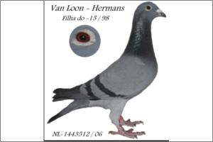 "Azul Van Loon 512 Extra" Raça: Van Loon Fêmea azul Tipo: Reprodutor Filha do 15/98 pai de mais 25 primeiros. A mãe é filha do casal douro de TH.Bours Elsloo««1160887/96x2358081/02». Nos pombais de TOP da Holanda vi vários irmãos desta femea512/06. O-15/98 é um dos melhores reprodutores da Holanda e o melhor do Hermans.