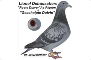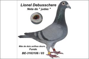 "A - 106 LIONEL DEBUSSCHERE" Raça: Debusschere x GABY Fêmea Azul Tipo: Reprodutor O Pai é filho do celebre « JUDAS » x GEBROKEN SLAG. A Mãe é filha do « BLAUWEN ALIBABA x FATIMA BLAUW. NO sangue desta femea encontra-se : Judas - Kleinen - Moriska - Alibaba( 1*-ASD.K.B D. B-91) - Bijter e Tamme Stichelbout.