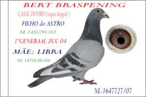 "ASTRO PENA BRANCA" Raça: JANSSEN BRASPENING Macho azul guia branca Tipo: Reprodutor FILHO DO CASAL DOURO BERT BRASPENNING «« ASTRO ++ LIBRA »» VÁRIOS IRMÃOS DESTE SUPER REPRODUTOR SÃO BASE DA LOUELLA VÁRIOS IRMÃOS NA REPRODUÇÃO DE BERT BRASPENNING incluindo IRMÃO NINHO VÁRIOS IRMÃOS COM PRIMEIROS NACIONAIS
