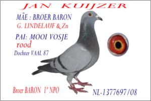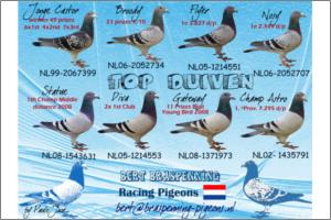 "AZUL JAN KUIJZER" Raça: KUIJZER Fêmea Azul Tipo: Reprodutor Filho do Irmão do BARON LINDELAUF Filho da Meia Irmã do TURBO Este borracho é néto do Vaal 87 4+1º sobrinho do Turbo1º Duffel 3421p & 7º Duffel 4574p & 12º Strombeek 6931p sobrinha do 137 1º Strombeek 10832p & 1ºGhislain 10167p Este borracho é irmão de dois pombos com varias classificações nos 10 primeiros numa media de 4000 pombos por prova. Reune o sangue Lindelauf x Kuizer. Lindelauf sagrou-se Campeão Nacional de Velocidade por 2 vezes. Campeonatos ganhos pelos Lindelauf National Championships of the last 5 years: 3.,4.,6 national N P O Youngsters loft 2.,6.,6.,8 national N P O Yougsters bird 1, 1, 6, national NPO Vitesse loft 1, 5, 7, 9, 10, national NPO Vitesse bird 1ºe ,2ºe ,5º,Nat. Orleans 130.000 pombos 1ºReims 18964 p -- 1º-2º-3º Ciney 6506 p --- 1º Morlincourt 30.000 p -- 1º Mettet 6476 p -- 1º Rethel 24.000 p -- 1º 2º 3º Marche 8009 p -- 1º 2º Laon 21108 p -- 1º Epernay 20.000 p -- 1º 2º 3º Morlincourt 7.565 p -- 1º Montargis 16308 p -- 1º Nat. Orleans 7331 p -- 1º Orlians 7038 p --1º Montargis 6800 p -- 1º Provins 29.322 p -- 1º 2º 3º Rethel 22019 p -- 1º Orleans 5274 p -- 1º 2º 3º Marche 6435 p -- 1º Etampes 11500 p -- 1º Orleans 5300 p