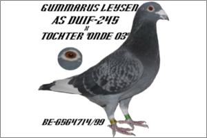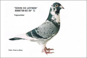 "Dr. Leysen 03-99- Crak" Raça: Leysen 03-Janssen Macho Pedrado Guias Branca Tipo: Reprodutor Este crak deve ser o unico a reproduzir em portugal deste Pombal (já não existe). E filho do ASDUIF 245/90 e da filha do ONDE 03. Este pombo é irmão do pai do RAMBO93 que é pai Kannibaal Faz casal com a 33/06 neta do Kannibaal Os filhos deste casal são os mais cobiçados da linha Kannibaal