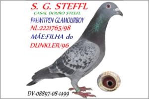 "Pedrado Glamorboy-08" Raça: Janssen Macho Pedrado Tipo: Reprodutor Este pombo é irmão de mais 66 primeiros. E filho do super «Witpen Glamourboy 98 e néto do célebre De Glamorboy87 &Tocter Rocky83». A mãe é filha do «Dunker Eijerkamp 96 (zoon wonderboy 06) &e da Tochter"Het Wonder"». Neste sangue encontra-se:James Bond,Zigo,Wonderboy,Rocky,Fameuse05,MerckxDe Oude03.