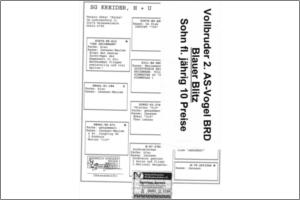 "Vermelha Lecke202" Raça: Albert Marcelis-jans Fêmea vermelho Tipo: Reprodutor Filha do 122/00 Der ROTE-SG-Theo &Markus Lecke. O122/00-10preise 1. AS-Vogel der RV 3.AS-Vogel25.Bezirk 3.Nat.Weitst.BRD 5/1659p-404km & 10/1543p-404km 70/1488p-503km &8/1374p-404km 7/1275p-503km & 43/1278p-467km 11/1114p-625km & 24/775p-625km. Amãe é Die Ruppert 13 preise 1:Bester jahr. Vogel RV-Heinrich &Bettina Kraft