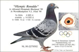 "VERKERK Penas branca DIAMANTE" Raça: VERKERK Macho azul guias brancas Tipo: Reprodutor Filho casal " RONEVO x TWEETY " Ronevo é filho OLYMPIC RONALDO 1st Olympic Allrrond. Blackpool 1999 e ganhou :1 st Cock WHZB 1998 , 1 st Nat. Acecock 1998 , 1 st Nat. Acep. Allr. 1º Ablis 4985 p , 4º Bourges 3668 p , 3º Bourges 2499 p , 3º Chateauro 2222 p , 4º Chateauro 2703 p. e da " Evolution " ganhou 1 st Nat. Acehen 2000 , 2 nd Hen WHZB ( 1 st Y ), 4 th Acep.WHZB (1 st H ) , 6 th Na