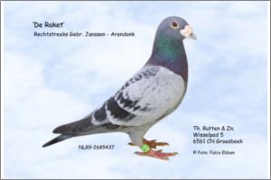 "Raket Junior 132 extra reprodu" Raça: Janssen Arendonk Macho Azul Tipo: Reprodutor " De Raket Junior 132 " Gebr. Janssen Arendonk " De Raket Junios 132 is Halfbrother van: 1e Nat.Montlucon 655km 6.541 p, 2e Nat.Pont St. Max 365km , 10e Nat. Offenburg 396 km 3.541 p ( Rising Star ) filho " Raket 89 - 2685437/89 is a ( grand )father + 39 first pricewinners, This Raket is a direct son from the OUDE Raket 6264440/79 from the Gebr. Janssen, Grandson OUDE GEELOGER 1967.X Daughter de LOUIS . Daughter from de LOUIS X MADONNA the Best from the best Janssen Pigeons. Raket Junior 132 is Halfrother from Van: 1e National Montlucon655km