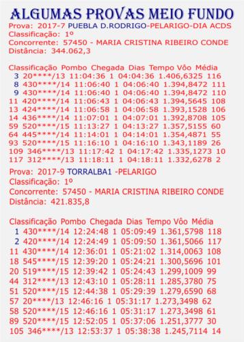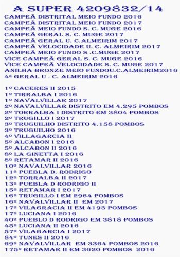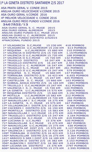 1º VILAGARCIA S.C,MUGE 15 230 KM 418 POMBOS 1º VILAGARCIA U.C.ALMEIRIM 15 230 KM 613 POMBOS 1º REQUENA U.C,ALMEIRIM 15 660 KM 210 POMBOS 1º VALENCIA II DISTRITO Z/S 15 720 KM 1.157POMBOS 1º VALENCIA II U.C.ALMEIRIM 15 720 KM 168 POMBOS 1º VALENCIA II S.C.MUGE 15 720 KM 132 POMBOS 1º TRUGILLO DISTRITO 16 247 KM 6.366 POMBOS 1º TRUGILLO DISTRITO Z/S 16 247 KM 2.555 POMBOS 1º TRUGILLO U. C. ALMEIRIM 16 247 KM 390 POMBOS 1º TRUGILLO S, C, MUGE 16 247 KM 261 POMBOS 2º TRUGILLO II U.C.ALMEIRIM 15 247 KM 579 POMBOS 3º REQUENA S. C. MUGE 15 660 KM 147 POMBOS 3º TORRALBA DISTRITO Z/S 16 423 KM 6.655 POMBOS 4º TRUGILLO I S. C. MUGE 15 247 KM 445 POMBOS 5º CASTELLON S. C. MUGE 15 660 KM 163 POMBOS 5º SOBRAL ADIÇA DISTRI Z/S 16 165 KM 1983 POMBOS 7º TRUJILLO I U.C.ALMEIRIM 15 247 KM 612 POMBOS 7º VALENCIA I S. C. MUGE 15 720 KM 144 POMBOS 8º LA GINETA U.C.ALMEIRIM 15 575 KM 250 POMBOS 9º REQUENA DISTRITO Z/S 15 660 KM 3.192 POMBOS 9º MOTILLA U.C.ALMEIRIM 15 582 KM 212 POMBOS 10º VALENCIA U.C.ALMEIRIM 15 720 KM 202 POMBOS 12º NAVALVILLAR I S.C.MUGE 16 275 KM 266 POMBOS 14º LA GINETA S. C. MUGE 15 575 KM 167 POMBOS 17º VILLAGARCIA I DISTR Z/S 15 230 KM 4.986 POMBOS 19º CACERES I DISTRITO Z/S 16 194 KM 882 POMBOS 24º MONTILLA DISTRITO Z/S 15 583 KM 3.177 POMBOS 36º NAVALVILLAR I U.C.MUGE 15 275 KM 426 POMBOS 37º TRUGILLO I DISTRITO Z/S 15 247 KM 3.164 POMBOS 69º LUCIANA DA S.C.MUGE 15 376 KM 419 POMBOS 69º LUCIANA D U.C.ALMEI 15 376 KM 530 POMBOS 71º NAVALVILLAR S.C MUGE 15 275 KM 467 POMBOS 72º NAVALVILLAR U.C.ALMEIRI 15 275 KM 530 POMBOS 74º La GINETA GP DIST Z/S 15 575 KM 3.127 POMBOS 81º VALENCIA I DISTRITO Z/S 15 720 KM 3.120 POMBOS 109º TORRALBA II DISTRI Z/S 16 423 KM 3.514 POMBOS 140º NAVALVILLAR DISTRI Z/S 16 275 KM 3.364 POMBOS 141º ARROYO S SER I DIST Z/S 16 189 KM 2.007 POMBOS 226º ALBACON II DISTRI Z/S 16 382 KM 3.153 POMBOS 356º ALBACON I DISTRIT Z/S 16 382 KM 3.424 POMBOS 404º LICIANA DA DISTRITO 15 376 KM 2797 POMBOS