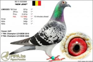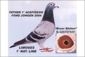 Brother to ‘Zwarten As’ 1. prov. acebird long distance KBDB 2009 5. Nat. acebird long distance (over 4 races) 2009 10. Nat. acebird long distance KBDB 2009 Co-winner 2. Nat. championship long distance KBDB 2009 1. prize / 3. Nat. Brive - 17,456 birds 1. prize / 47. Nat. Limoges - 11,869 birds 23. prov. Tours - 2,898 birds 96. Nat. Cahors - 7,347 birds 179. Nat. Souillac - 7,597 birds Brother to ‘Zwartje’ 3. prov. acebird long distance KBDB 2006 1. Limoges – 233 birds 53. prov. Limoges – 3,665 birds 88. Nat. Limoges – 15,504 birds 1. Poitiers – 109 birds 2. Poitiers – 418 birds 18. prov. Poitiers – 1,879 birds 1. Argenton – 93 birds 20. prov. Argenton – 2,106 birds 22. Nat. Zone Argenton – 4,479 birds 2. Brive – 196 birds 11. prov. Brive – 2,770 birds 22. Nat. Brive – 17,456 birds 2. Angouleme – 127 birds 17. prov. Angouleme – 2,070 birds 2. Angouleme – 95 birds 27. prov. Angouleme – 2,009 birds Brother to ‘Limoges’ 4. prov. acebird long distance KBDB 2005 Brother to ‘Blue Rudi’ breeder of 1. prize winner One Loft Race Thailand 2009 (Declerq-Blancke) Brother to ‘Nest sis Blue Rudi’ Mother to 2010 bred ‘Black Lola’ (at Declerck-Blancke) 1. prize / 4. prov. Ablis - 10,425 birds 2. prize / 26. prov. Tours - 3,375 birds 3. prize / 46. prov. Clermont - 18,112 birds Brother to ‘Late Zwarten’ Breeder of top talent ‘Messi’ 2. prov. acebird long distance KBDB 2011 1. Ablis - 268 birds 1. Clermont - 146 birds 2. La Chartre – 291 birds 8. prov. La Chartre - 2,815 birds 2. Limoges - 249 birds 4. prov. Limoges - 2,890 birds 8. Nat. Limoges - 14,673 birds 2. Tours - 249 birds 4. Clermont - 386 birds 10. Argenton – 288 birds 55. prov. Argenton - 3,125 birds 327. Nat. Argenton - 19,782 birds Breeder of ‘Iniesta’ 2. Chateauroux – 372 birds 16. prov. Chateauroux – 4,072 birds 86. Nat. Chateauroux – 25,263 birds 2. Clermont – 146 birds 4. Ablis – 417 birds 8. Tours – 346 birds 93. prov. Limoges – 2,890 birds 340. Nat. Limoges – 14,673 birds Brother to ‘Femke’ 1. Ablis – 427 birds 1. Clermont – 376 birds ‘De Perigueux’, great 1. prize winner & grandson to icons ‘Wittenbuik’ & ‘Limoges’ 1. Perigueux - 138 birds 6. prov. Perigueux - 1,053 birds 2. Ruffec - 278 birds 14. prov. Ruffec - 2,710 birds 24. Poitiers - 2,413 birds ‘Perigueux’ is full brother to ‘Den 18’ - wonder pair ‘Den 18’ x ‘tGoedje’ are parents to super trio - ‘Tours’ Co-winner 1. Nat. championship long distance KBDB 2010 Co-winner 2. Nat. championship long distance KBDB 2009 8. prov. acebird long distance KBDB 2009 1. prize / 6. prov. Tours - 2,898 birds 1. prize / 49. prov. Tours - 3,392 birds 1. prize / 28. prov. Tours - 2,791 birds 3. prov. Tours - 2,739 birds 47. Nat. Brive - 17,456 birds - ‘Bleken’ Co-winner 1. Nat. championship long distance KBDB 2010 4. Nat. acebird long distance KBDB 2010 3. prov. acebird long distance KBDB 2010 2. prov. Tours 2009 - 2,739 birds 16. Nat. Souillac 2010 - 7,045 birds 47. Nat. Tulle 2010 - 6,695 birds 66. Nat. Limoges 2010 -10,448 birds - ‘King’ 14. prov. Blois - 678 birds 27. prov. Bourges - 595 birds 68. prov. Bourges - 1,484 birds 147. Nat. Souillac - 7,045 birds ‘Perigueux’ is grandson to ‘Limoges’ & ‘Wittenbuik’ Vandenabeele Famous ‘Wittenbuik’ is winner of a/o 1. prov. Angoulême (old) - 2,450 birds 1. prov. Angoulême (2 y old) - 715 birds 1. prov. Limoges (old) - 2,309 birds 1. prov. Limoges (2 y old) - 876 birds 1. prov. Poitiers (old) - 2,713 birds 2. prov. Poitiers (old) - 1,435 birds Offspring to ‘Wittenbuik’ dominated one day pigeon racing worldwide!! ‘Limoges’ is winner of 1. Nat. Limoges - 13,631 birds In 2011 ‘Limoges’ offspring won a/o 1. Nat. Brive 2011 - 10,982 birds (at Leekens-Hermans) ‘Limoges’ is grandfather to a/o ‘Neptunus’ 1. prov. Chateauroux - 436 birds 1. Chartres - 164 birds 2. prov. Ruffec - 1,600 birds 8. prov. Chateauroux - 4,221 birds 13. prov. Ruffec - 554 birds 15. prov. Blois - 1,187 birds 21. prov. Blois - 1,345 birds