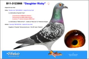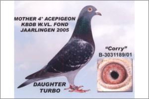 ‘Corry’, 5 star breeding hen direct from the wonder ace ‘Turbo’ Original Gaby Vandenabeele Daughter to famous ‘Turbo’ 1. prov. acebird long distance Western Flandres 1993 2. prov. acebird long distance Western Flandres 1994 2. Nat. Brive - 5,132 birds ‘Turbo’ is a direct son to nr. 1 Vandenabeele founding father ‘Kleinen’ Other children to ‘Kleinen’ are - ‘Wittenbuik’ 1. prov. Angoulême (old) - 2,450 birds 1. prov. Angoulême (2 y old) - 715 birds 1. prov. Limoges (old) - 2,309 birds 1. prov. Limoges (2 y old) - 876 birds 1. prov. Poitiers (old) - 2,713 birds 2. prov. Poitiers (old) - 1,435 birds Offspring to ‘Wittenbuik’ dominated one day pigeon racing worldwide!! - ‘Picanol’ 1. prov. acebird West Flandres 1983 - ‘Fideel’ 2. Nat. Limoges - 6,911 birds Grandfather ‘Blauwe Fideel’ 1. Nat. Brive (old) - 4,719 birds 1. Nat. Brive (yearlings) - 3,970 birds - ‘Wolfgang’ 1. Limoges - 140 birds 1. Poitiers - 118 birds 3. prov. Limoges - 1,630 birds 13. prov. Angouleme - 2,366 birds 19. prov. Tours - 2,463 birds 20. Nat. Limoges - 8,362 birds Mother is ‘Black Beauty’ Full sister to ‘Zwarte Baron’ 3. Nat. acebird middle distance KBDB 1998 ‘Zwarte Baron’ is nest brother to ‘Blacky’ 1. Blois - 1,234 birds Strain Flor Engels & Sons ‘Blacky’ offspring is in 2011 responsible for 1. Nat. Brive 2011 - 10,982 birds (at Leekens-Hermans)