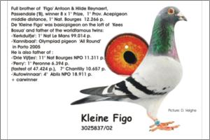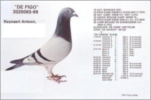 ‘Figo’ is full brother to ‘De Keizer’ 1. prov. acebird middle distance 1998 14x 1. prize ‘Figo’ is full brother to ‘Kleine Figo’ (Bosua), breeder of ‘Kannibaal’ Olympiad bird allround Porto 2005 4. Nat. acebird middle distance 2004 1. Ablis - 2,091 birds 1. Peronne - 2,030 birds 1. PS Maxence - 1,694 birds 5. NPO Chantilly - 13,953 birds