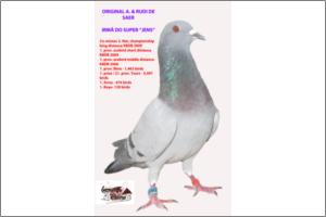 | Raça: GABY VANDENABEELE ORIGINAL ANTOINE & RUDI DE SAER - CAMPEÃO NACIONAL DE FUNDO DA KBDB EM 2010 E VICE CAMPEÃO EM 2009 SOBRINHA SUPER "JENS" - 1. prov. acebird SD KBDB 2009 & 2. prov. acebird MD KBDB 2006 Son to ‘Geschelpte Neptunus’ x ‘Het Pootje’ Full brother to ‘Jens’ Co-winner 2. Nat. championship long distance KBDB 2009 1. prov. acebird short distance KBDB 2009 1. prov. acebird middle distance KBDB 2006 1. prov. Blois - 1,463 birds 1. prize / 21. prov. Tours - 3,497 birds 1. Arras - 474 birds 1. Roye- 120 birds 3. prize / 19. prov. Chateauroux - 3,709 birds 3. prize / 20. prov. Tours - 3,497 birds 59. Nat. Brive - 17,456 birds 25. prov. Argenton - 1,273 birds 36. prov. Chateauroux - 2,211 birds 58. Zone Brive - 6,089 birds Full brother to ‘Brother Jens’ 1. Heidelberg - 312 birds 7. prov. Heidelberg - 3,206 birds 10. prov. Cahors - 1,194 birds 29. Nat. Cahors - 8,651 birds