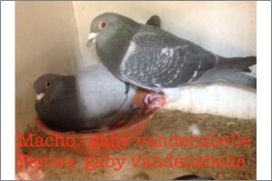 | Raça: GABY VANDENABEELE DIRECTO DE ANTOINE & RUDI DE SAER - CAMPEÃO NACIONAL DE FUNDO DA KBDB EM 2010 E VICE CAMPEÃO EM 2009 Sobrinha do "Monty" Sobrinha do "Derby" Monty: 1. prize / 11. Nat. Montauban 2010 - 6,654 birds 34. Nat. Souillac 2010 - 7,045 birds ‘Monty’ is grandfather to 2010 bred youngster ‘Messi’ 2. prov. acebird long distance KBDB 2011 1. Ablis - 268 birds 1. Clermont - 146 birds 2. La Chartre – 291 birds 8. prov. La Chartre - 2,815 birds 2. Limoges - 249 birds 4. prov. Limoges - 2,890 birds 8. Nat. Limoges - 14,673 birds 2. Tours - 249 birds 4. Clermont - 386 birds 10. Argenton – 288 birds 55. prov. Argenton - 3,125 birds 327. Nat. Argenton - 19,782 birds "Derby" - 13º Nat. Deby Limoges contra 11 995 pombos entre outras classificações de top