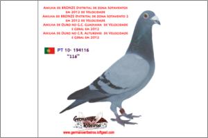 "116" Raça: CASAL BELGA ANILHA DE OURO DE VELOCIDADE E GERAL NO G.C. GUADIANA EM 2012 ANILHA DE OURO DE VELOCIDADE E GERAL NA S.C. ALTURENSE EM 2012 ANILHA DE BRONZE DISTRITAL DE VELOCIDADE ZONA SOTAVENTO 2 EM 2012 ANILHA DE BRONZE DISTRITAL DE VELOCIDADE ZONA SOTAVENTOS EM 2012