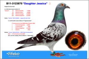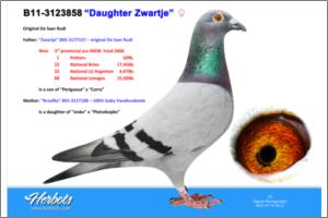 Father is brother to ‘Bleken’, one of Belgium’s supreme long distance racers in 2010 Winner of Co-winner 1. Nat. championship long distance KBDB 2010 4. Nat. acebird long distance KBDB 2010 3. prov. acebird long distance KBDB 2010 2. prov. Tours 2009 - 2,739 birds 16. Nat. Souillac 2010 - 7,045 birds 47. Nat. Tulle 2010 - 6,695 birds 66. Nat. Limoges 2010 -10,448 birds Direct son to wonder pair ‘Den 18’ x ‘tGoedje’; parents to super trio - ‘Tours’ Co-winner 1. Nat. championship long distance KBDB 2010 Co-winner 2. Nat. championship long distance KBDB 2009 8. prov. acebird long distance KBDB 2009 1. prize / 6. prov. Tours - 2,898 birds 1. prize / 49. prov. Tours - 3,392 birds 1. prize / 28. prov. Tours - 2,791 birds 3. prov. Tours - 2,739 birds 47. Nat. Brive - 17,456 birds - ‘Bleken’ Co-winner 1. Nat. championship long distance KBDB 2010 4. Nat. acebird long distance KBDB 2010 3. prov. acebird long distance KBDB 2010 2. prov. Tours 2009 - 2,739 birds 16. Nat. Souillac 2010 - 7,045 birds 47. Nat. Tulle 2010 - 6,695 birds 66. Nat. Limoges 2010 -10,448 birds - ‘King’ 14. prov. Blois - 678 birds 27. prov. Bourges - 595 birds 68. prov. Bourges - 1,484 birds 147. Nat. Souillac - 7,045 birds ‘Den 18’ is full brother to amazing ‘Perigueux’ 1. Perigueux- 138 birds 6. prov. Perigueux - 1,053 birds 2. Ruffec - 278 birds 14. prov. Ruffec - 2,710 birds 24. Poitiers - 2,413 birds ‘Perigueux’ is top breeder & father to - ‘Zwarten As’ 1. prov. acebird long distance KBDB 2009 5. Nat. acebird long distance (over 4 races) 2009 10. Nat. acebird long distance KBDB 2009 Co-winner 2. Nat. championship long distance KBDB 2009 1. prize / 3. Nat. Brive- 17,456 birds 1. prize / 47. Nat. Limoges - 11,869 birds 23. prov. Tours - 2,898 birds 96. Nat. Cahors - 7,347 birds 179. Nat. Souillac - 7,597 birds - ‘Zwartje’ 3. prov. acebird long distance KBDB 2006 - ‘Limoges’ 4. prov. acebird long distance KBDB 2005 - ‘Blue Rudi’ breeder of 1. prize winner One Loft Race Thailand 2009 (Declerq-Blancke) - ‘Nest sis Blue Rudi’ mother to 2010 bred ‘Black Lola’ (at Declerck-Blancke) 1. prize / 4. prov. Ablis- 10,425 birds 2. prize / 26. prov. Tours - 3,375 birds 3. prize / 46. prov. Clermont - 18,112 birds - ‘Femke’ 1. Ablis– 427 birds 1. Clermont – 376 birds - ‘Late Zwarten’ breeder of top talent ‘Messi’ 2. prov. acebird long distance KBDB 2011 1. Ablis - 268 birds 1. Clermont - 146 birds 2. La Chartre – 291 birds (8. prov. 2,815 birds) 2. Limoges - 249 birds (4. prov. 2,890 birds & 8. Nat. 14,673 birds) 2. Tours - 249 birds 4. Clermont - 386 birds 10. Argenton – 288 birds (55. prov. 3,125 birds) ‘Den 18’ is grandson to ‘Limoges’ & ‘Wittenbuik’ Vandenabeele ‘t Goedje’ is full sister to ‘t Pootje’, great mother to - ‘Jens’ Co-winner 2. Nat. championship long distance KBDB 2009 1. prov. acebird short distance KBDB 2009 2. prov. acebird middle distance KBDB 2006 1. prov. Blois - 1,463 birds 1. prize / 21. prov. Tours - 3,497 birds 1. Arras - 474 birds 1. Roye - 120 birds 3. prize / 19. prov. Chateauroux - 3,709 birds 3. prize / 20. prov. Tours - 3,497 birds 59. Nat. Brive - 17,456 birds 25. prov. Argenton - 1,273 birds 36. prov. Chateauroux - 2,211 birds 58. Zone Brive - 6,089 birds - ‘Brother Jens’ 1. Heidelberg - 312 birds 7. prov. Heidelberg - 3,206 birds 10. prov. Cahors - 1,194 birds 29. Nat. Cahors - 8,651 birds