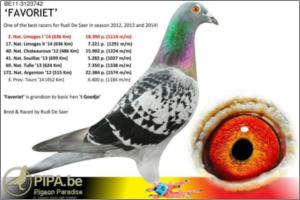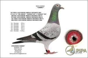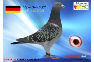 ‘Groten’ is father to 2. prov. acebird long distance (old) KBDB 2006 ‘Groten’ is a direct son to ‘Pletsekopske’ ‘Pletsekopske’ is grandmother to ‘Pipo’ 1. Clermont - 541 birds 1. Clermont - 282 birds 35. prov. Argenton - 5,134 birds 37. prov. Tours - 1,981 birds 47. prov. Tours - 3,135 birds ‘Pletsekopske’ is great grandmother to ‘Pipo Junior’ & ‘Black Lola’ - ‘Pipo Junior’ 1. Arras - 868 birds 7. prov. Limoges - 3,079 birds 15. Zone Limoges - 6,810 birds 83. Nat. Limoges - 14,211 birds - ‘Black Lola’ at Declerck-Blancke winner of 1. Ablis - 242 birds 4. prov. Ablis - 10,425 birds 2. Tours - 393 birds 26. prov. Tours - 3,375 birds 3. Clermont - 481 birds 46. prov. Clermont - 18,112 birds Para mais informação consulte : http://www.pipa.be/toppigeons/toppigeon.php?id=91199#42797