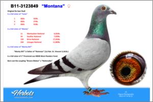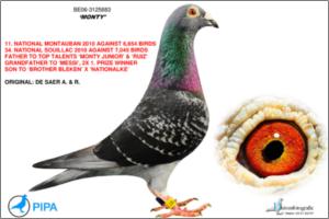 Full brother to top racer ‘Monty’ 1. prize / 11. Nat. Montauban 2010 - 6,654 birds 34. Nat. Souillac 2010 - 7,045 birds ‘Monty’ is grandfather to 2010 bred youngster ‘Messi’ 2. prov. acebird long distance KBDB 2011 1. Ablis - 268 birds 1. Clermont - 146 birds 2. La Chartre – 291 birds 8. prov. La Chartre - 2,815 birds 2. Limoges - 249 birds 4. prov. Limoges - 2,890 birds 8. Nat. Limoges - 14,673 birds 2. Tours - 249 birds 4. Clermont - 386 birds 10. Argenton – 288 birds 55. prov. Argenton - 3,125 birds 327. Nat. Argenton - 19,782 birds