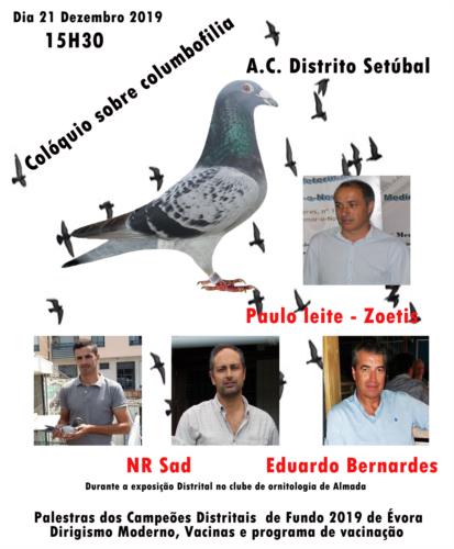 Caros Columbófilos do Distrito de Setúbal, o colóquio que esta preparado e que vai acontecer durante o próximo sábado pelas 15:30 tem intervenientes muito interessantes, temos opor um lado o homem forte das vacinas em Portugal, que representa a columbovac, depois teremos a equipa NR sad que no fim do distrito de Évora conseguiu alcançar o titulo de campeões distritais de Fundo, numa campanha durissima, e depois teremos Eduardo Bernardes que já pegou em vários clubes e os transformou em grandes sucessos, passando de 5 a 6 concorrentes a perto de 80, sem encarecer as campanhas... um verdadeuiro lider que nos vai dar a conhecer o seu segredo...compareça...visite a exposição no sábado e assista ao colóquio.