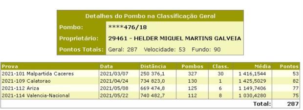 Bom dia, para cedência os pais de uma excelente pomba e de variadissimas irmãs, ficam algumas classificações da "Albergaria" vencedora de 1º Calatarao 2021