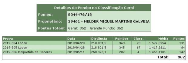 Vice Campeã nacional Absoluta 2019 e Pombo Ás Distrital ZA Lisboa - Geral