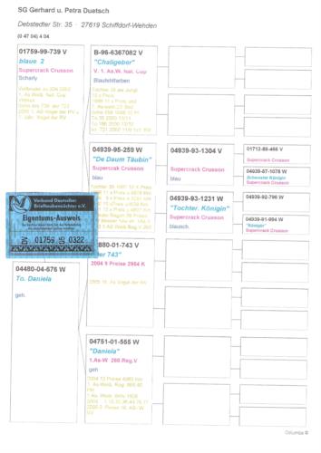 De salientar que o pombo que adquiri em Kassel o 01759-05-0322, linha do Supercrack Crusson, era filho direto do 01759-99-739, bisavo do pombo ÀS Derby Riachos 2015.
