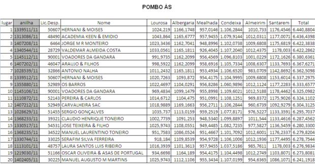 CLASSIFICAÇÃO DO POMBO ÁS NO POMBAL DA ASSOCIAÇÃO DO PORTO ANTES DA PROVA FINAL E APÓS O ÚLTIMO TREINO