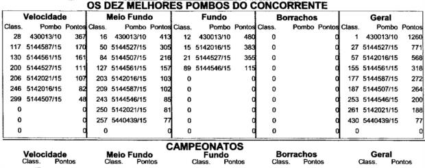 CAMPEÃO DA GERAL, CAMPEÃO DE MEIO- FUNDO, 2º DE VELOCIDADE, 2º DE FUNDO, 5º,8º,12º e20º POMBOS VELOCIDADE, 6º,8º,10º,13º,16ºe18ºPOMBOS DE MEIO-FUNDO, 11º,16ºe19º POMBOS DE FUNDO; CAMPEÃO CAMPEONATO DE BORRACHOS; VENCEDOR DA TAÇA ELIMINATÓRIA