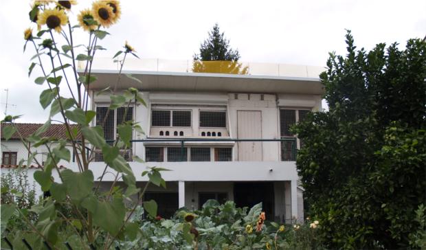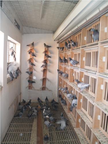 Pombal com 8 metros de largura e 2 de profundidade, constituído por 4 divisões (pombal de 4.80 metros com 30 ninhos, Volieres laterais para machos e fêmeas viúvas, com 1.60 metros cada.