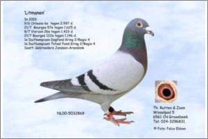 "LITMANEN JR.(RAYTJE)" IRMÃO LEGÍTIMO DE MISTER RAYMOND 7º NACIONAL PERONNE 2007 ENTRE 12718 P. AQUISIÇÃO DIRECTA A TH.RUTTEN EN ZN.-GROESBEEK Fotos anexas: Irmão: Mister Raymond Pai: NL.5032868-00 - LITMANEN - Grandson to " JONGE MERCKX '78" 1º PROVINCIAL ACEPIGEON ONE DAY LONG DISTANCE. SUPER BREEDER FATHER TO A.O. MISTER RAYMOND.