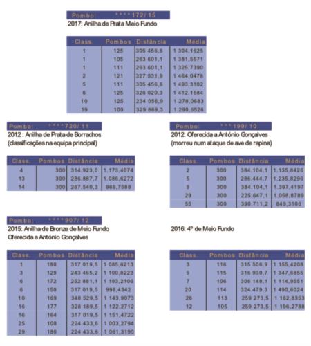 3º, 4º, 6º, 2x9º, 10º - Anilha de Ouro Geral e Anilha de Ouro Velocidade em 2017.