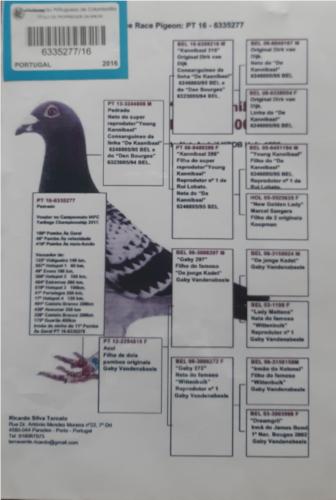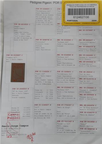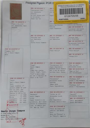 Descrição: fêmea original PAULO CAMPOS, neta do famoso reprodutor "GEERINCKX 678", reprodutor base com vários pombos olímpicos na sua descendência. É também consanguíneo do "CEGO", um dos bons reprodutores da colónia de PAULO CAMPOS.