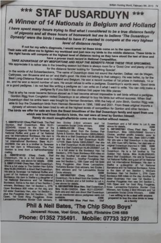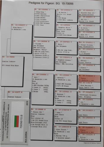 Descrição: macho descendente de excelentes pombos, nomeadamente "HARRY", 1.º pombo ás Nacional Grande Fundo, de JAN HOOYMANS, "POPEYE", "ASTERIX" e "BEYONCE", de JO HENDRIKS.